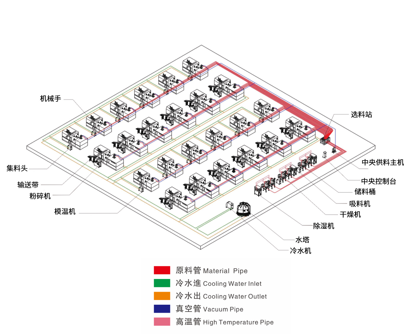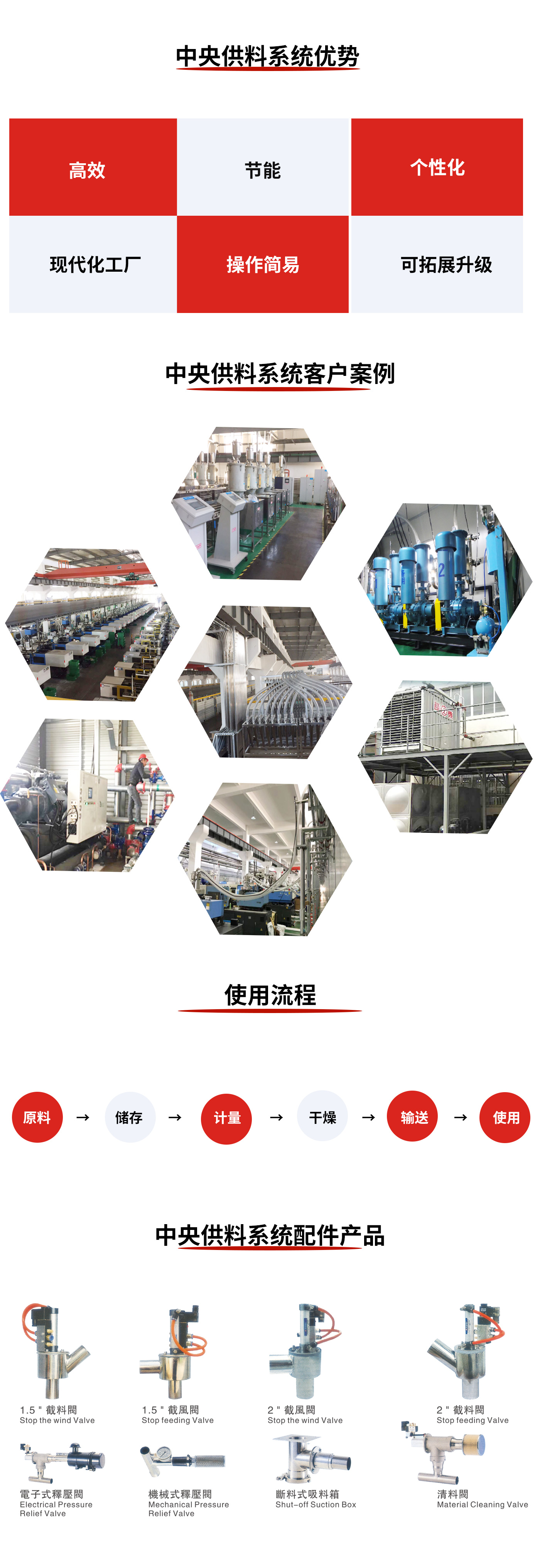 中央供料系统主要组成部分包括:中央控制站、旋风集尘器、脉动集尘器、原料分配站、储料桶、拌料机、干燥机、除湿机、称重式搅拌机、中央式料斗、粉碎机、机边粉碎机、机械手、截风阀、截料阀、及料管和风管等等。