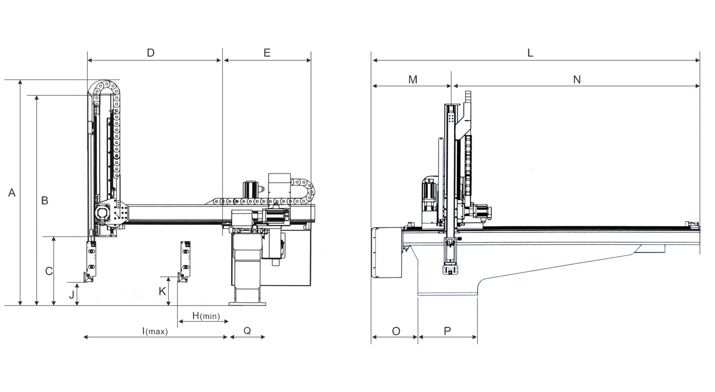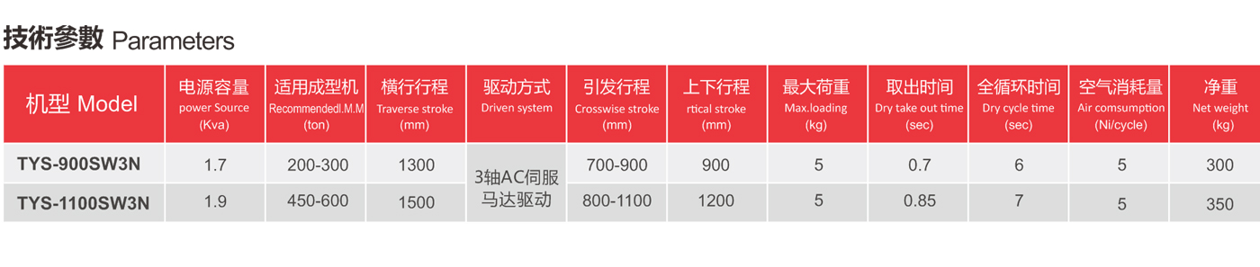 TYS輕型開放式(牛頭式)機械手,標配為雙截開放式,三軸伺服驅動。TYS輕型系列為快速機械手,主要針對一些注塑生產周斯在3-6秒內的產品,如一次性餐盒、刀叉,薄壁包裝產品等。TYS輕型系列機械手最快迴圈週期時間達2.8秒,取物時間達0.6秒...