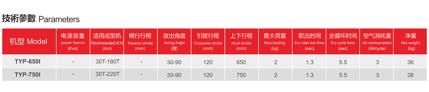 TYP系列適用於30T-180T的各種臥式射出成型機的成品及水口取出。上下、引拔、旋出、旋入均採用氣壓驅動,速度快,高效率、經濟實惠型機械手臂。安裝機械手臂可增加產能(10-30%),降低不良率,保證操作人員的安全性,減少員工,精准控制生產量,減少浪費。