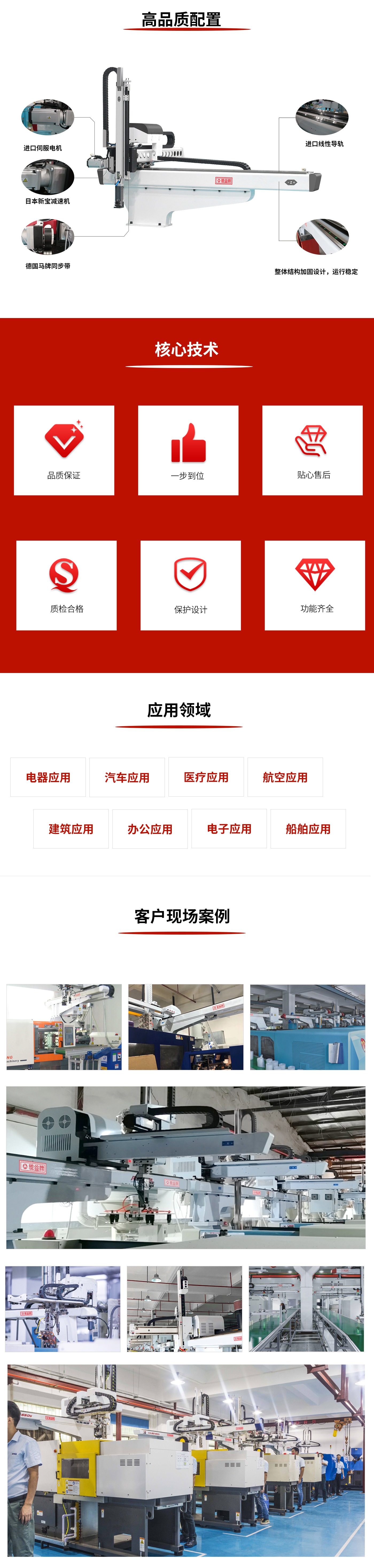 TYP系列適用於30T-180T的各種臥式射出成型機的成品及水口取出。上下、引拔、旋出、旋入均採用氣壓驅動,速度快,高效率、經濟實惠型機械手臂。安裝機械手臂可增加產能(10-30%),降低不良率,保證操作人員的安全性,減少員工,精准控制生產...