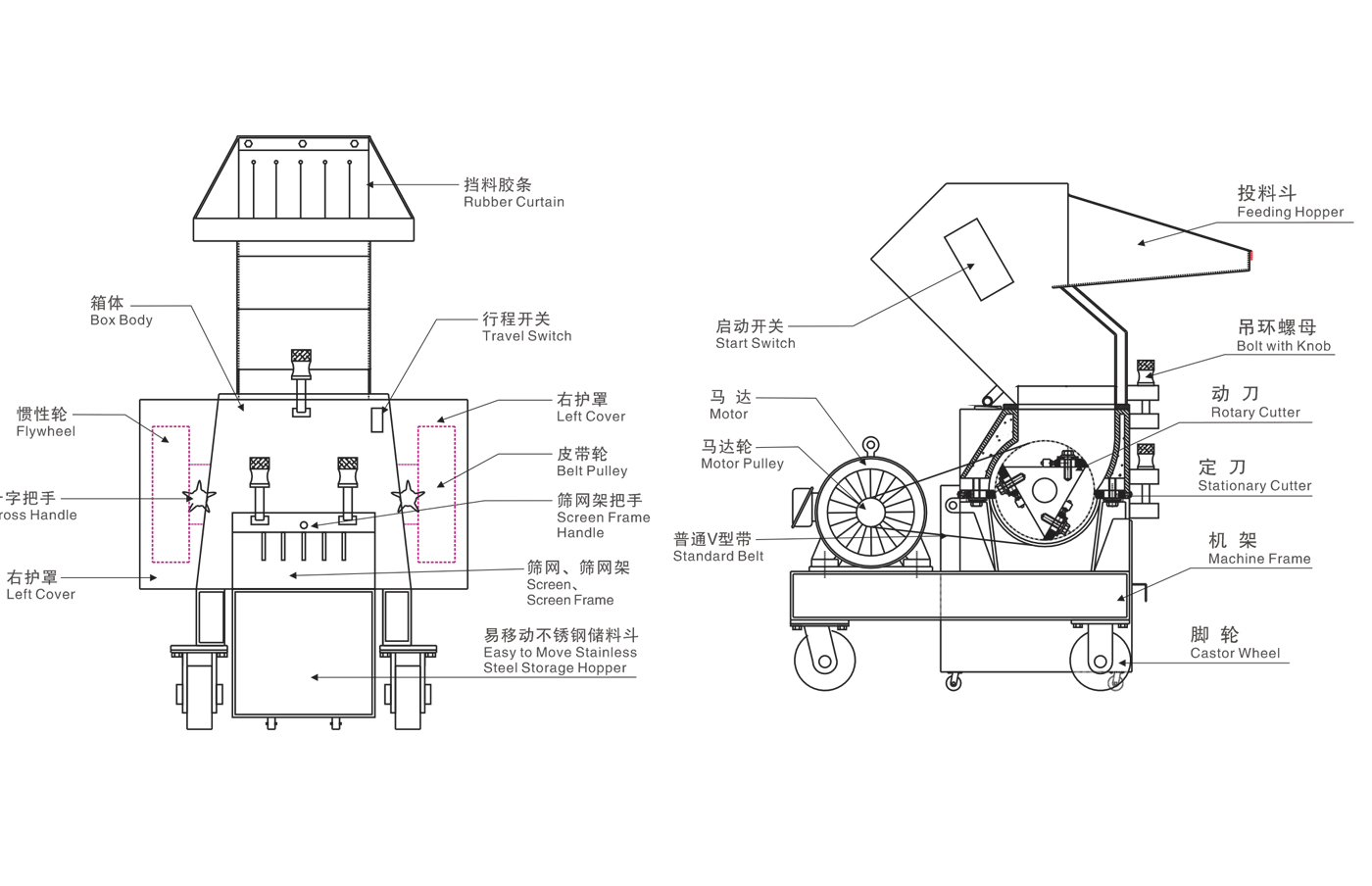 5、粉碎透明料和白料時,進料斗和篩綱請訂做为不銹鋼,以免在粉碎時油漆脫落。
