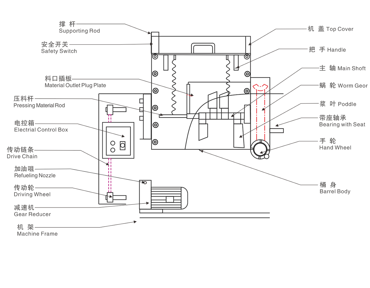4、料桶可作100°傾斜,軸與槳片360°旋轉。