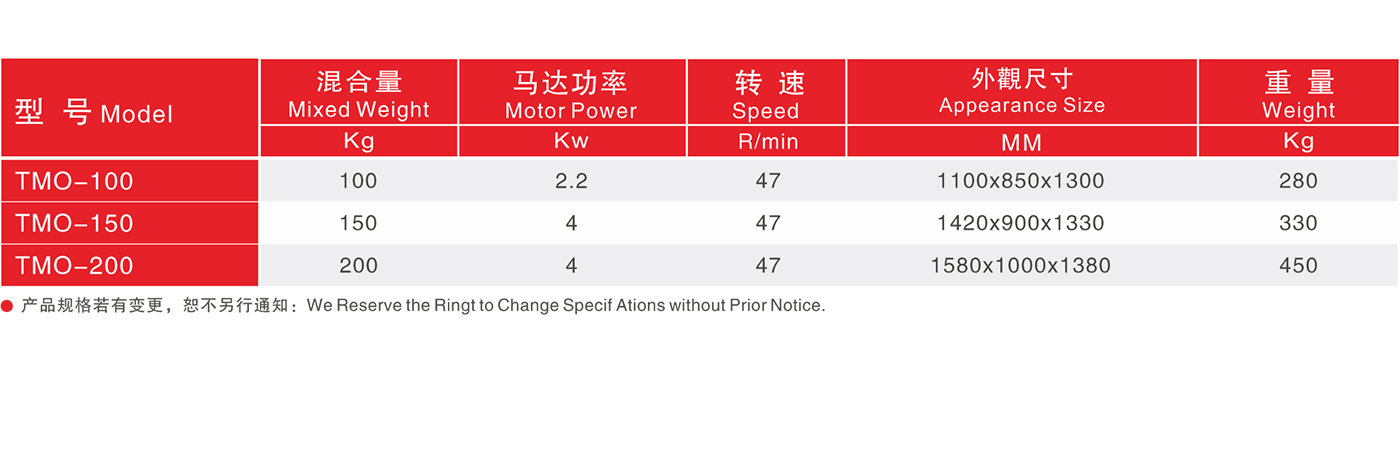 横式搅拌机 适用于新料与回收料、粒料与粉料和配色精度要求不高的原料与色母混合搅拌。桨叶片采用加厚不锈钢制作,与桶壁距离精密计算,拌料迅速、均匀。配用摆线针轮减速电机,噪音低,持久耐用。料桶可倾斜100°,方便卸料。